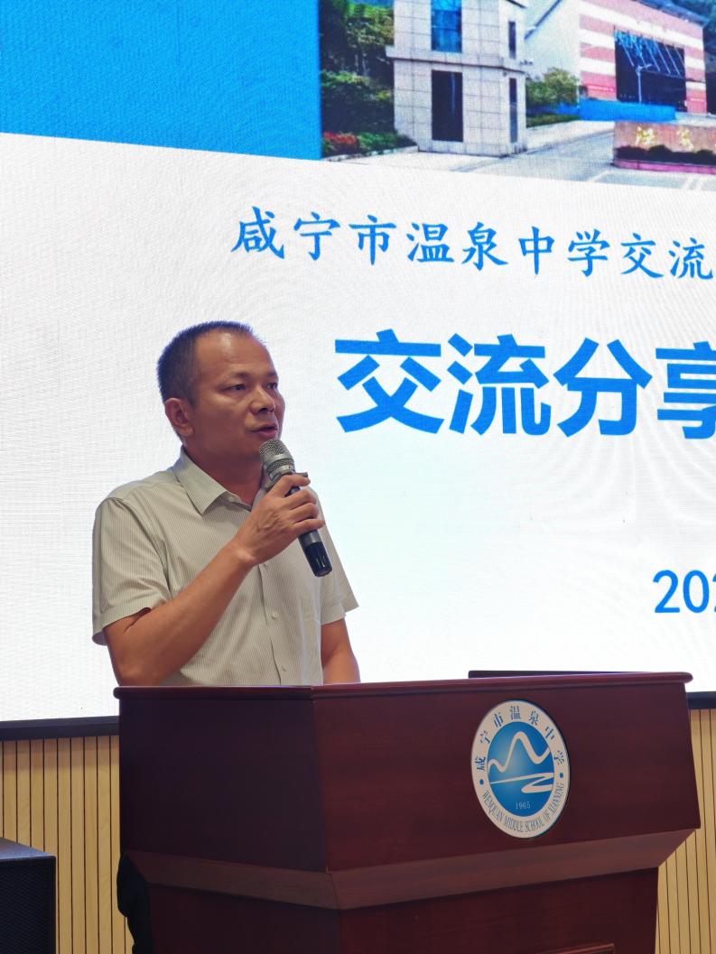 咸安区实验集团唐咸军校长作为派出学校代表发言。唐校长表示十分感谢区教育局和温泉中学提供的平台,并结合自身在温中的工作经历,深情赞扬了温泉中学“管理就是服务”“细节孕育内涵”的人文关怀和管理文化。唐校长对交流教师提出三点期望:以校为家安心工作;坚守师德传播实验精神;珍惜机会多学多实践,力争学有所成。