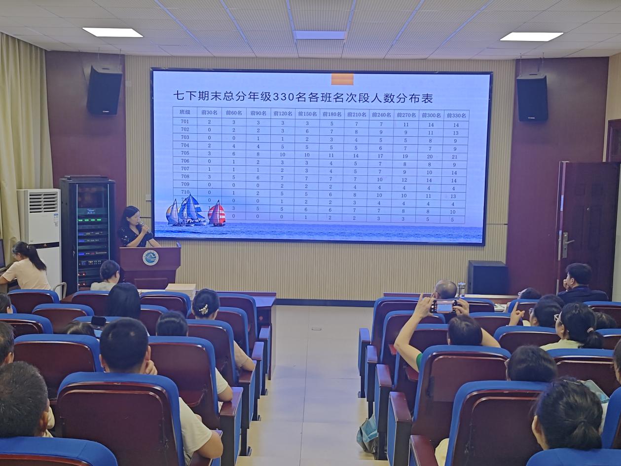 会议首先对七年级下学期期末考试进行了全面细致的质量分析。八年级教学负责人李瑶老师通过班综合排名、年级前330名分布等数据,深入剖析了教学中存在的问题与不足。