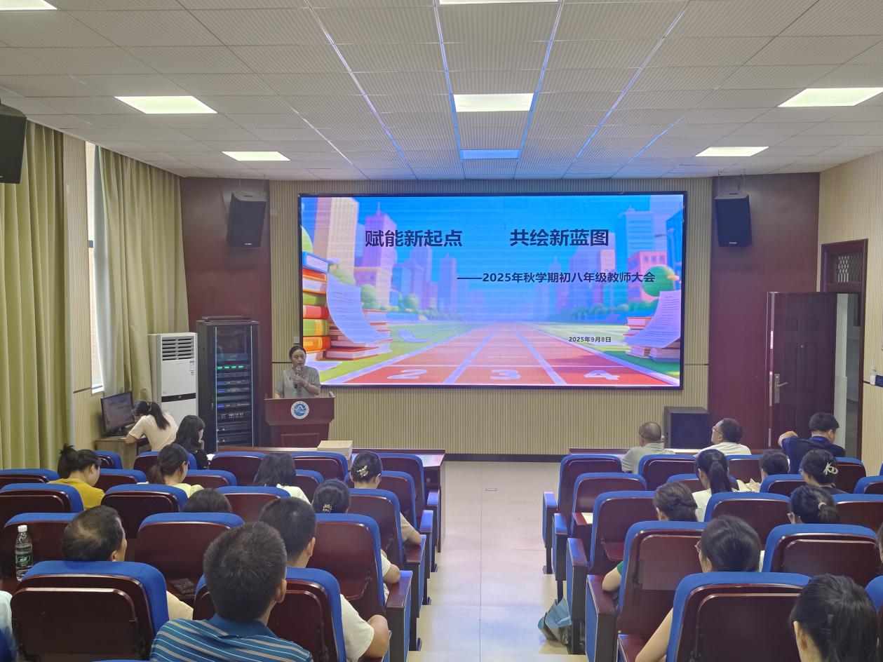 2025年9月8日,我校八年级新学期初教师大会在学校博雅楼报告厅隆重举行。本次会议以“赋能新起点共绘新蓝图”为主题,围绕考试质量分析、新学期工作安排和日常管理要求等内容展开,为新学期的教育教学工作指明了方向,凝聚了共识。