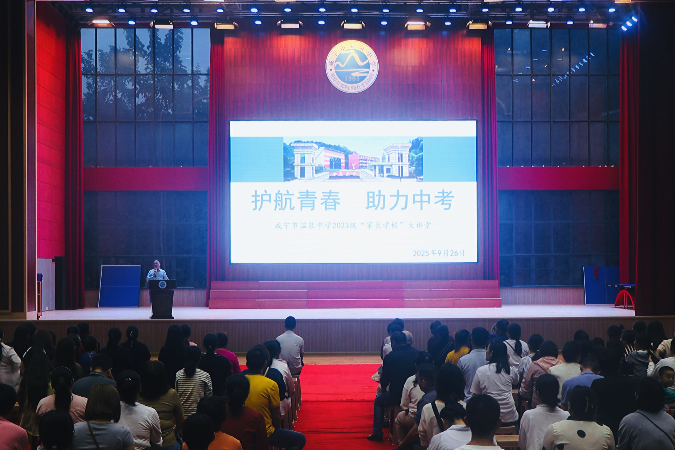 为凝聚家校合力,助力九年级学生和家长正确认知中考,科学缓解备考压力,9月26日晚6点,我校九年级以“护航青春,助力中考”为主题的家长会在体育馆隆重举行。