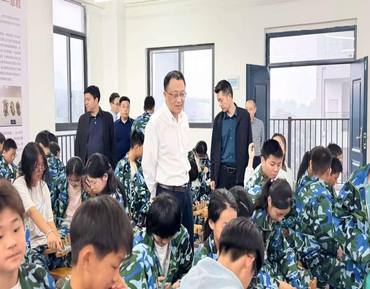 在编草鞋实践现场,领导深入了解活动设计理念,与学生交流实践感悟。学生在手工编织中重温革命岁月,体悟红军战士艰苦奋斗、坚韧不拔的精神,推动红色基因融入血脉,实现红色教育入脑入心。