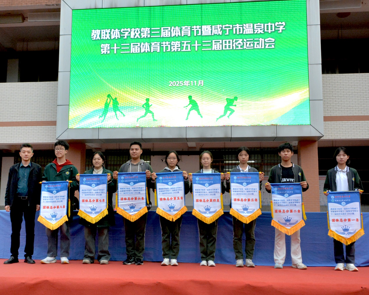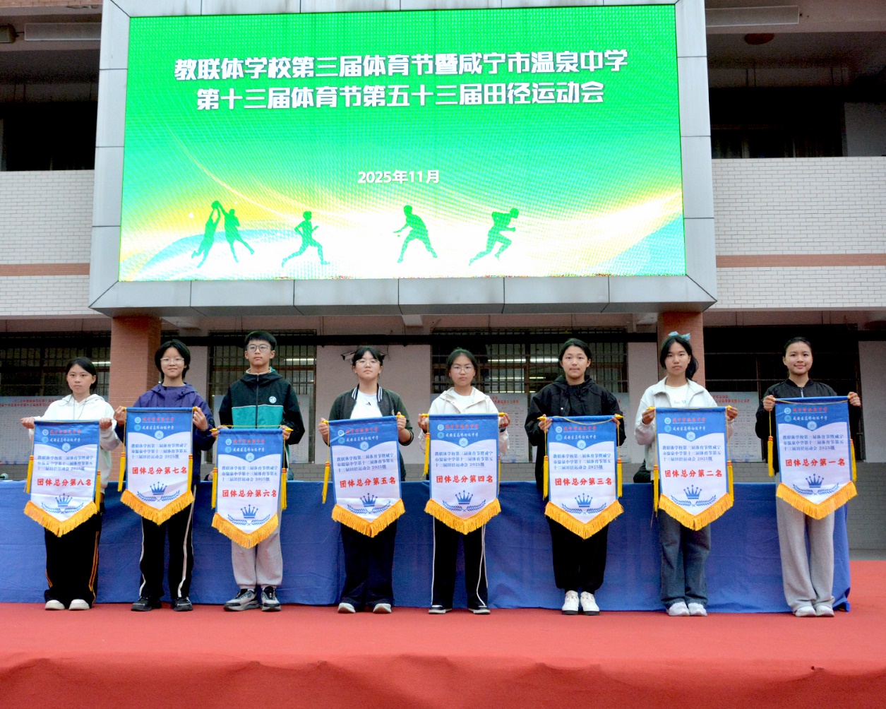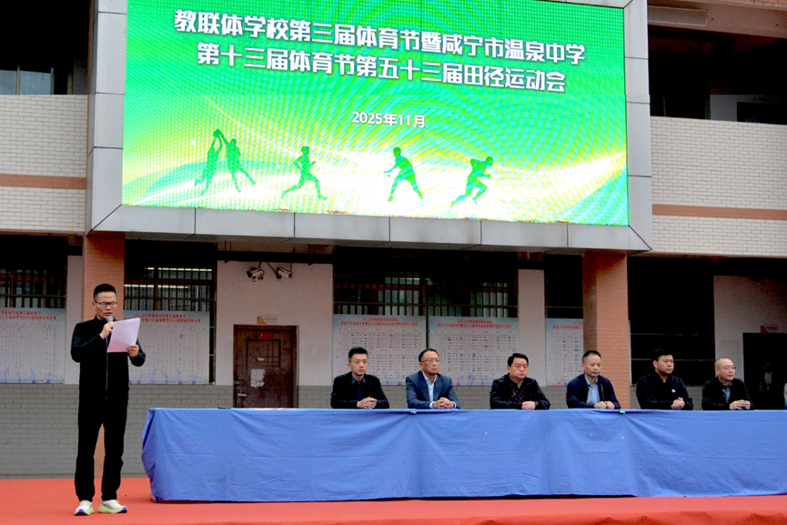 2025年11月5日下午,我校田径运动场上气氛热烈、掌声雷动,咸宁市温泉中学、咸安区马桥初级中学教联体学校第三届体育节暨温泉中学第五十三届田径运动会闭幕式在此隆重举行。在校领导、全体师生及教联体兄弟学校代表的共同见证下,本届运动会圆满完成各项赛事,顺利落下帷幕。