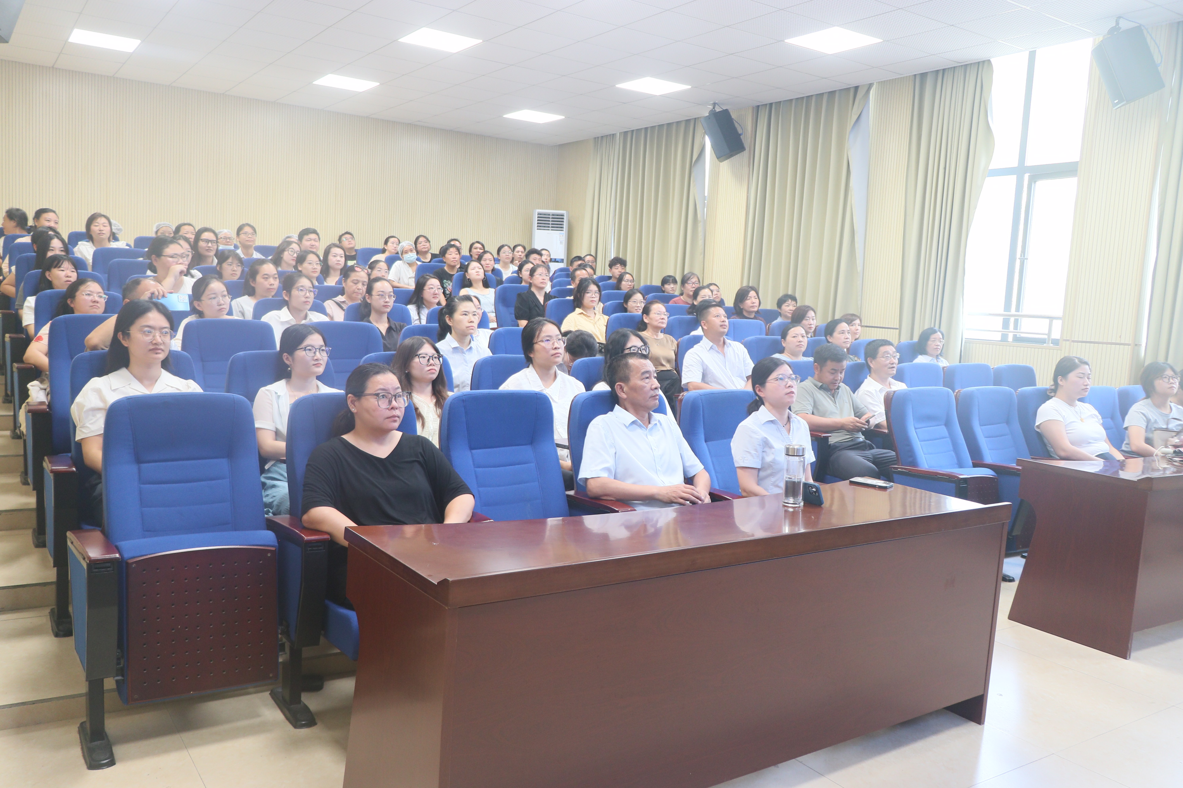 上午9时20分,各班学生在班主任的带领下有序入场。9时30分,观看活动准时开始。八年级4个班的学生与校领导齐聚萃华楼报告厅主会场,其他班级学生在班主任的组织下于教室同步观看。值得一提的是,本次观看活动实现了全员覆盖,科任教师、食堂后勤人员及保卫科保安统一在博雅楼集中观看,展现了全校师生团结一心的精神风貌。